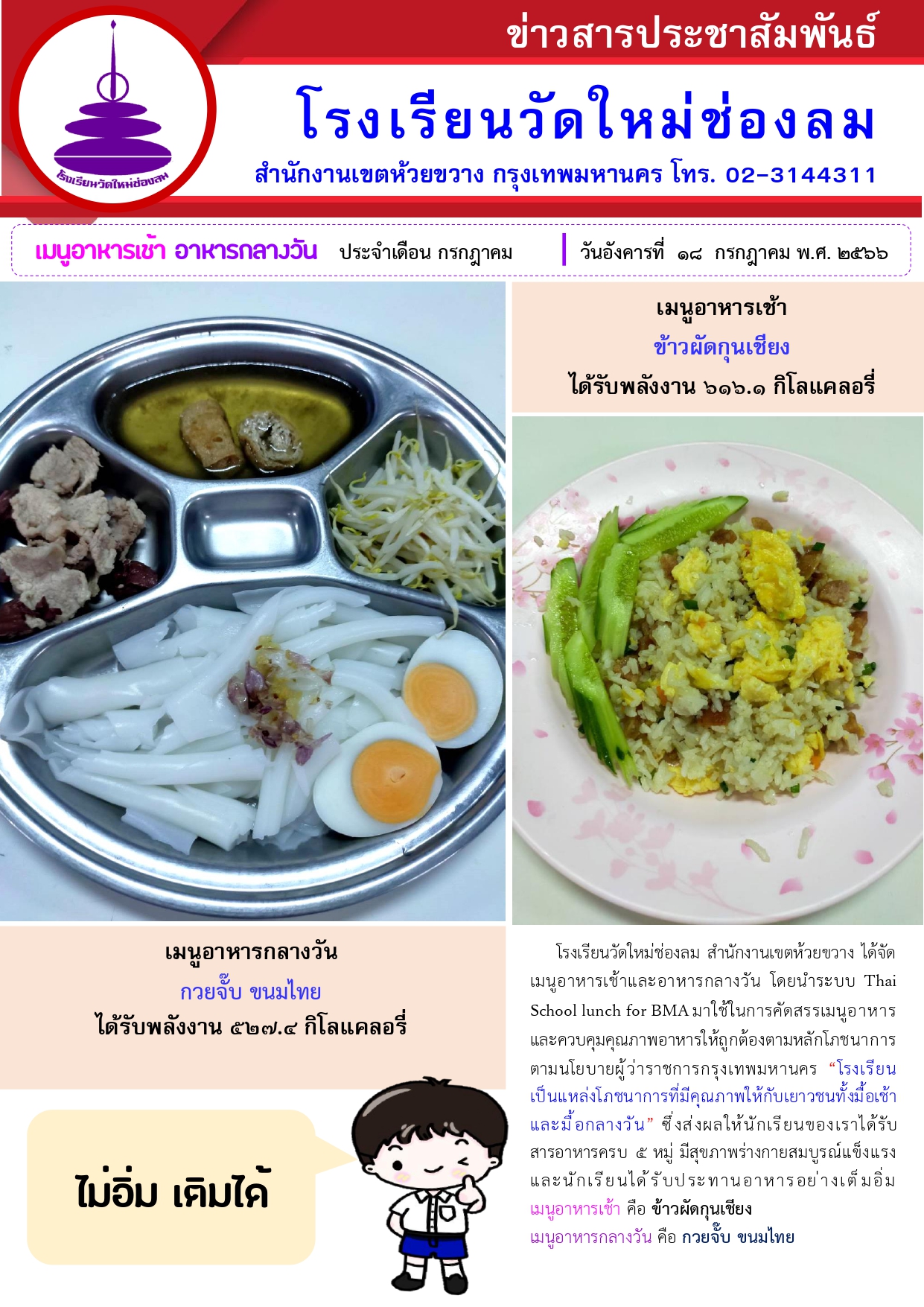 อาหารเช้า อาหารกลางวัน สำหรับนักเรียนโรงเรียนวัดใหม่ช่องลม ประจำวันอังคารที่ 18 กรกฎาคม 2566