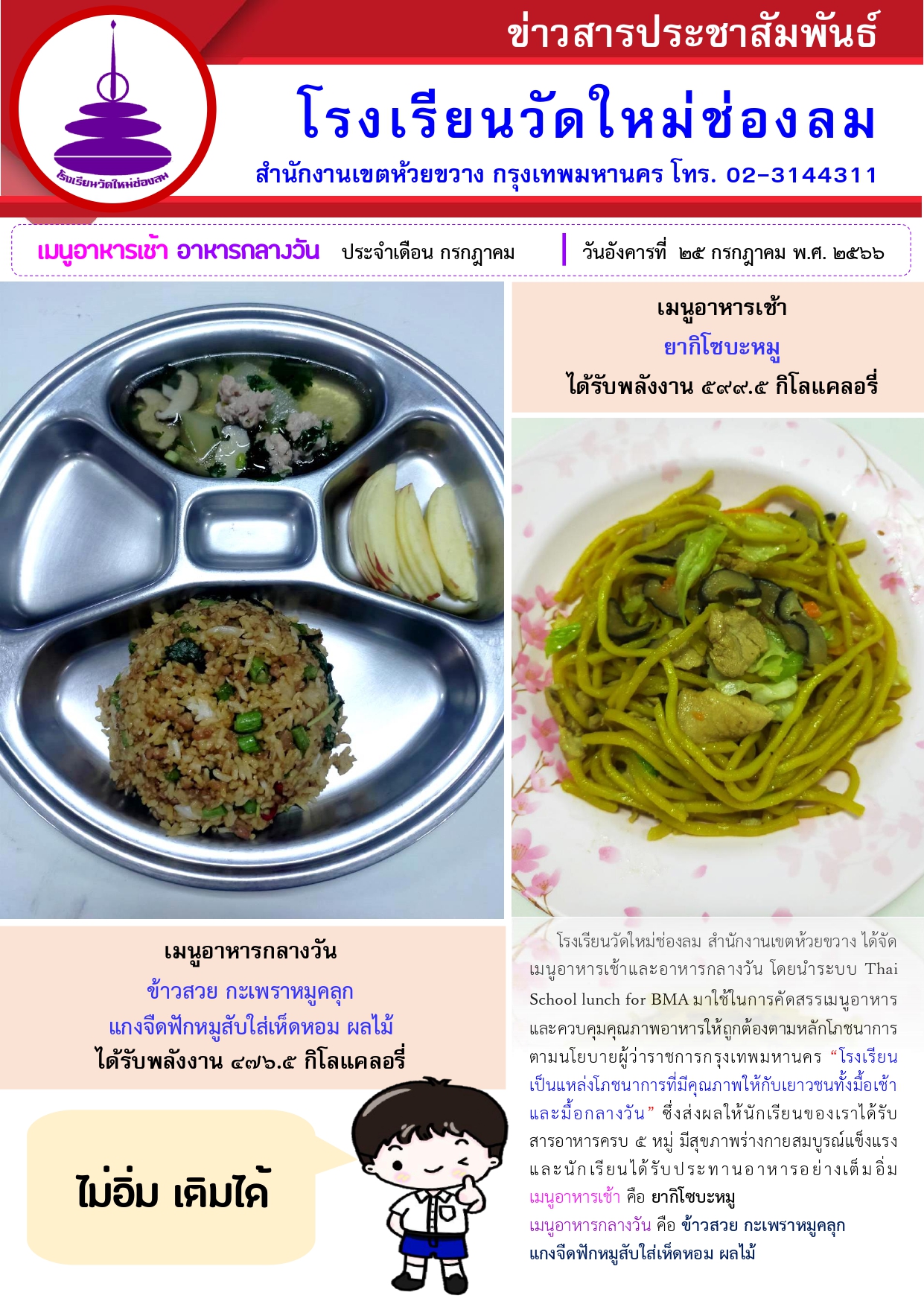 อาหารเช้า อาหารกลางวัน สำหรับนักเรียนโรงเรียนวัดใหม่ช่องลม ประจำวันอังคารที่ 25 กรกฎาคม 2566