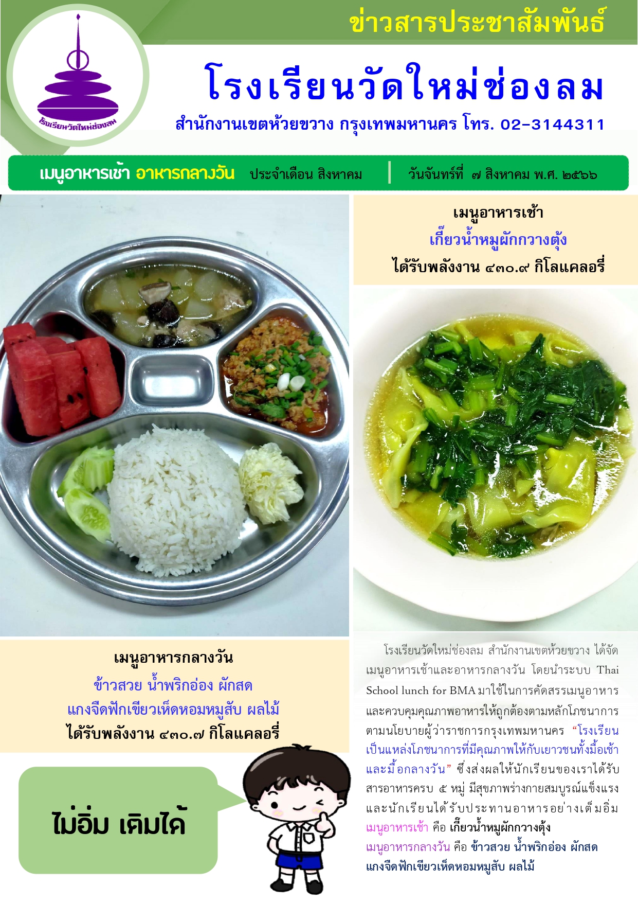 อาหารเช้า อาหารกลางวัน สำหรับนักเรียนโรงเรียนวัดใหม่ช่องลม ประจำวันจันทร์ที่ 7 สิงหาคม 2566