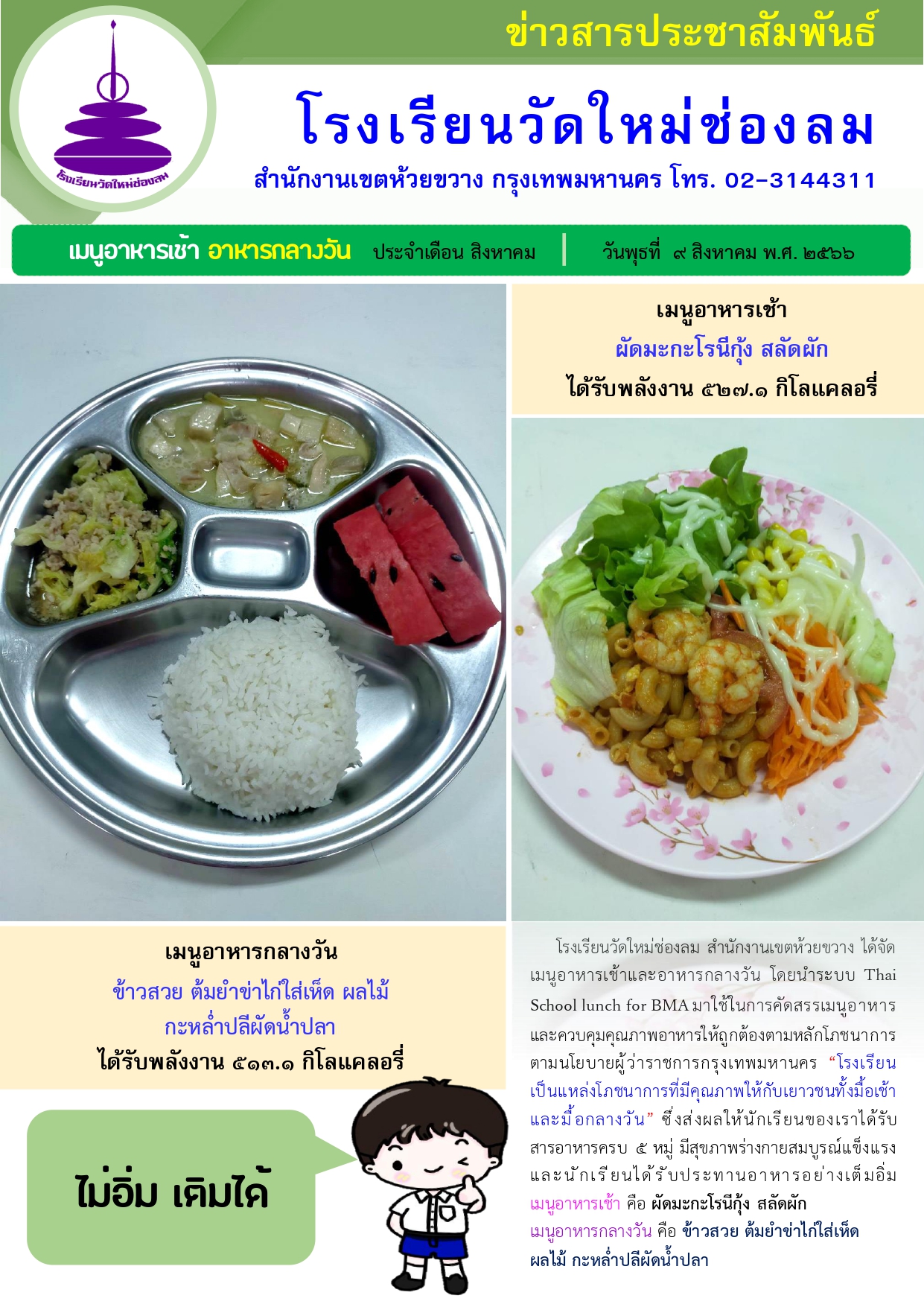 อาหารเช้า อาหารกลางวัน สำหรับนักเรียนโรงเรียนวัดใหม่ช่องลม ประจำวันพุธที่ 9 สิงหาคม 2566