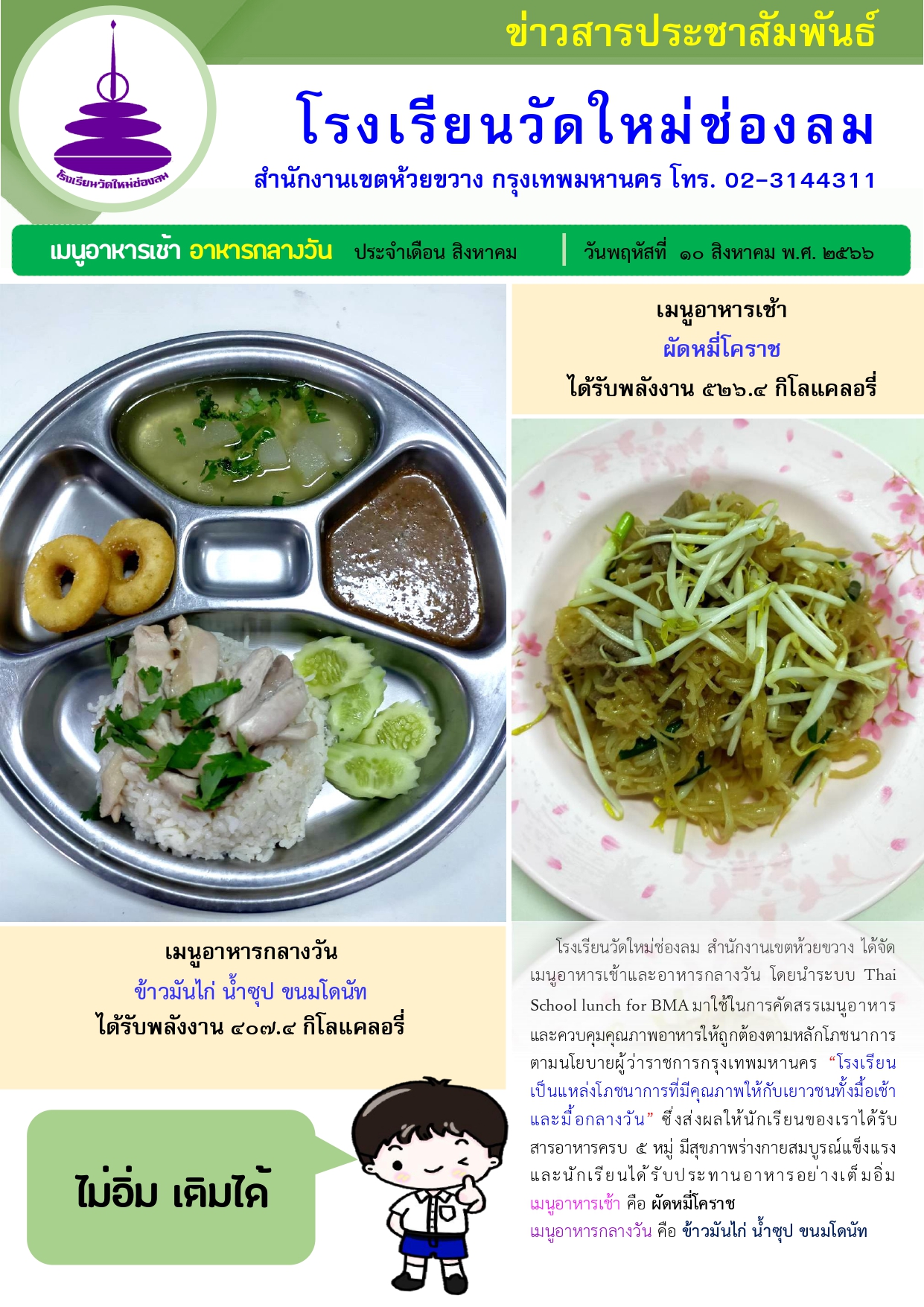 อาหารเช้า อาหารกลางวัน สำหรับนักเรียนโรงเรียนวัดใหม่ช่องลม ประจำวันพฤหัสบดีที่ 10 สิงหาคม 2566