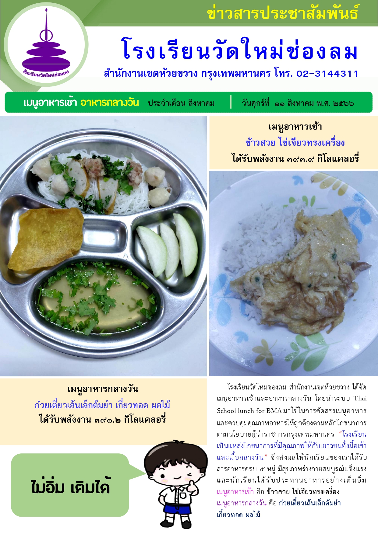 อาหารเช้า อาหารกลางวัน สำหรับนักเรียนโรงเรียนวัดใหม่ช่องลม ประจำวันศุกร์ที่ 11 สิงหาคม 2566