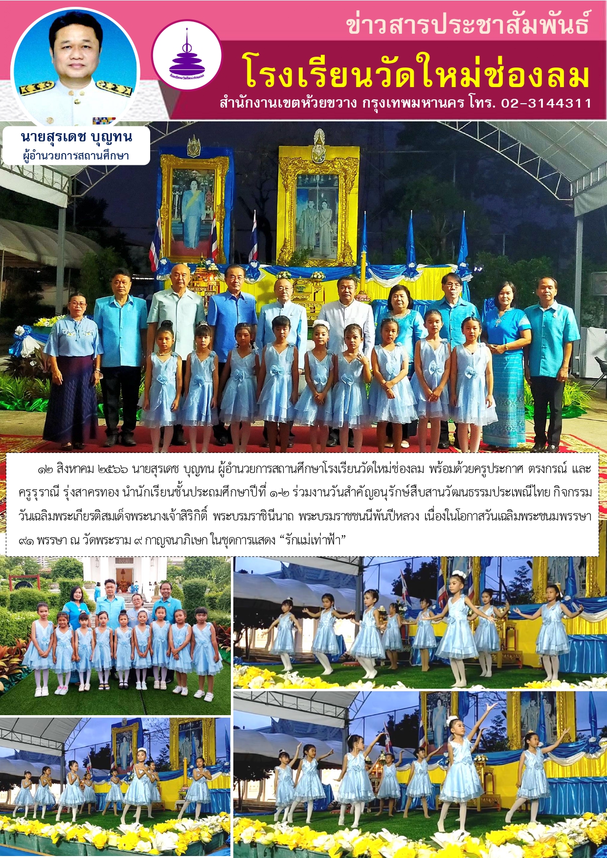 12 สิงหาคม 2566 นายสุรเดช บุญทน ผู้อำนวยการสถานศึกษาโรงเรียนวัดใหม่ช่องลม พร้อมด้วยครูประกาศ ตรงกรณ์ และครูรุราณี รุ่งสาครทอง นำนักเรียนชั้นประถมศึกษาปีที่ 1-2 ร่วมงานวันสำคัญอนุรักษ์สืบสานวัฒนธรรมประเพณีไทย กิจกรรมวันเฉลิมพระเกียรติสมเด็จพระนางเจ้าสิริกิติ์ พระบรมราชินีนาถ พระบรมราชชนนีพันปีหลวง เนื่องในโอกาสวันเฉลิมพระชนมพรรษา 91 พรรษา ณ วัดพระราม ๙ กาญจนาภิเษก ในชุดการแสดง “รักแม่เท่าฟ้า”