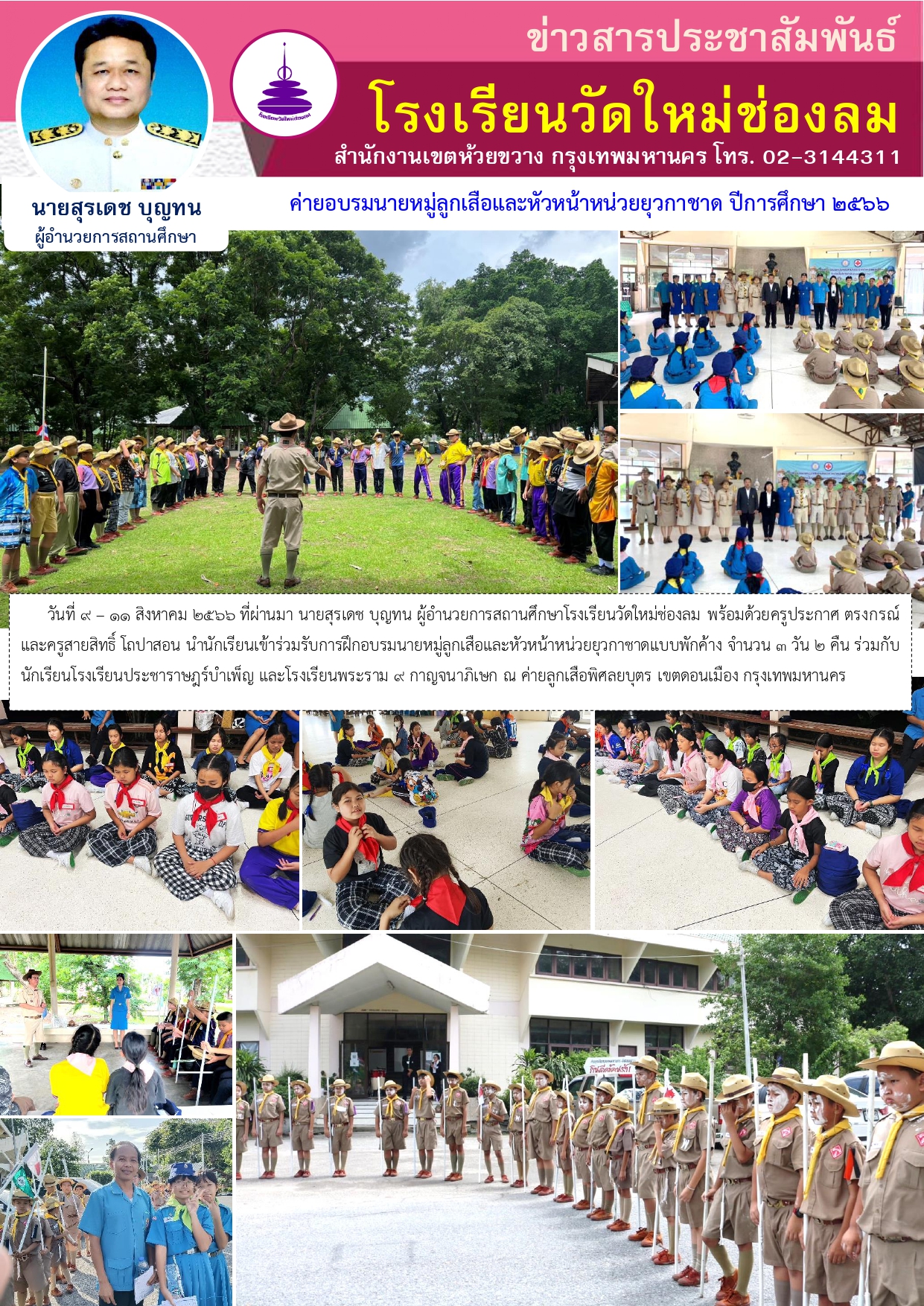 วันที่ 9 – 11 สิงหาคม 2566 ที่ผ่านมา นายสุรเดช บุญทน ผู้อำนวยการสถานศึกษาโรงเรียนวัดใหม่ช่องลม พร้อมด้วยครูประกาศ ตรงกรณ์ และครูสายสิทธิ์ โถปาสอน นำนักเรียนเข้าร่วมรับการฝึกอบรมนายหมู่ลูกเสือและหัวหน้าหน่วยยุวกาชาดแบบพักค้าง จำนวน 3 วัน 2 คืน ร่วมกับนักเรียนโรงเรียนประชาราษฎร์บำเพ็ญ และโรงเรียนพระราม ๙ กาญจนาภิเษก ณ ค่ายลูกเสือพิศลยบุตร เขตดอนเมือง กรุงเทพมหานคร