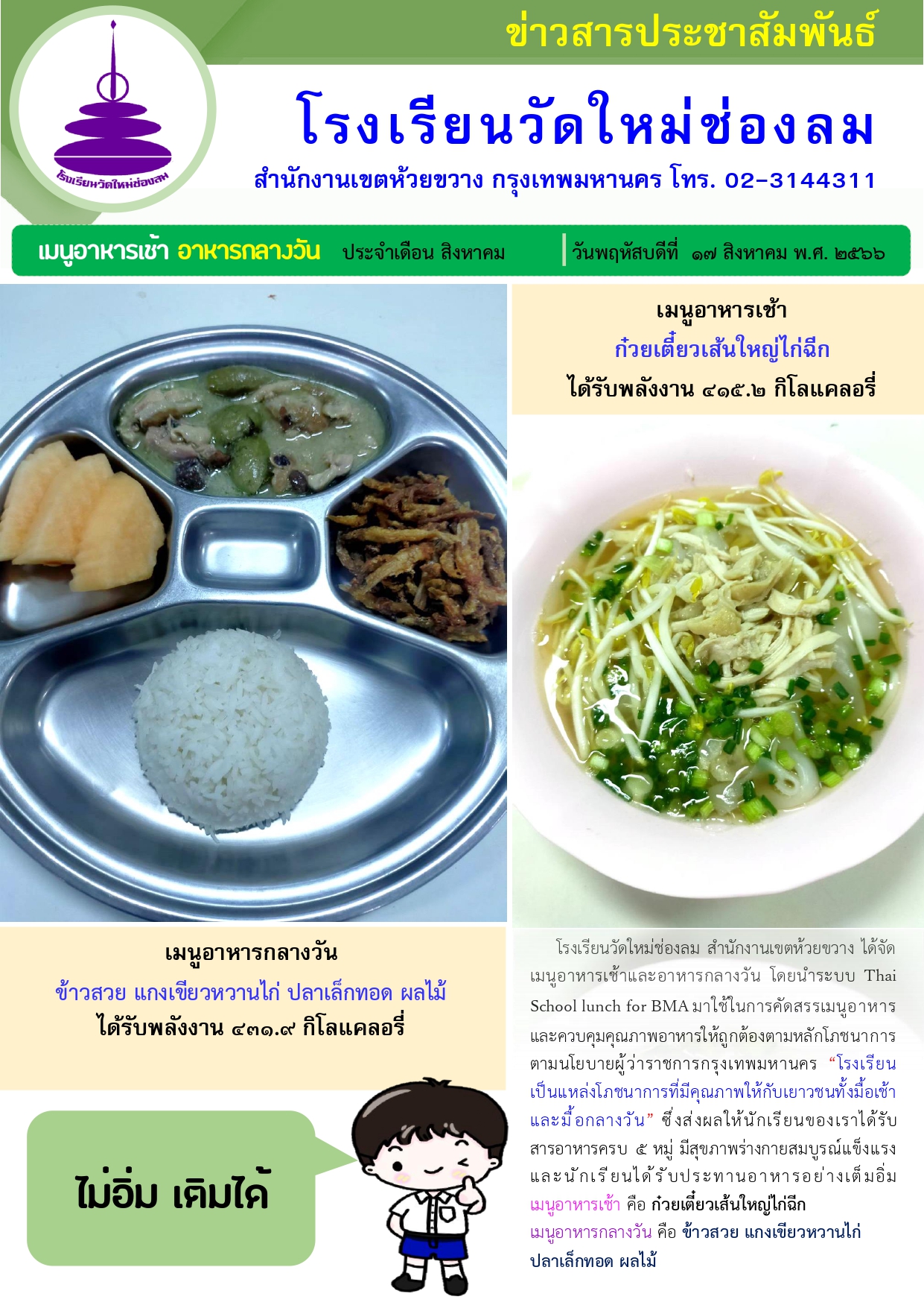 อาหารเช้า อาหารกลางวัน สำหรับนักเรียนโรงเรียนวัดใหม่ช่องลม ประจำวันพฤหัสบดีที่ 17 สิงหาคม 2566