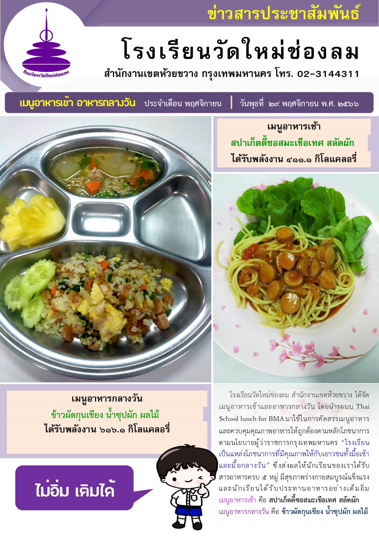 อาหารเช้า อาหารกลางวัน สำหรับนักเรียนโรงเรียนวัดใหม่ช่องลม ประจำวันที่ 30 พ.ย. 2566