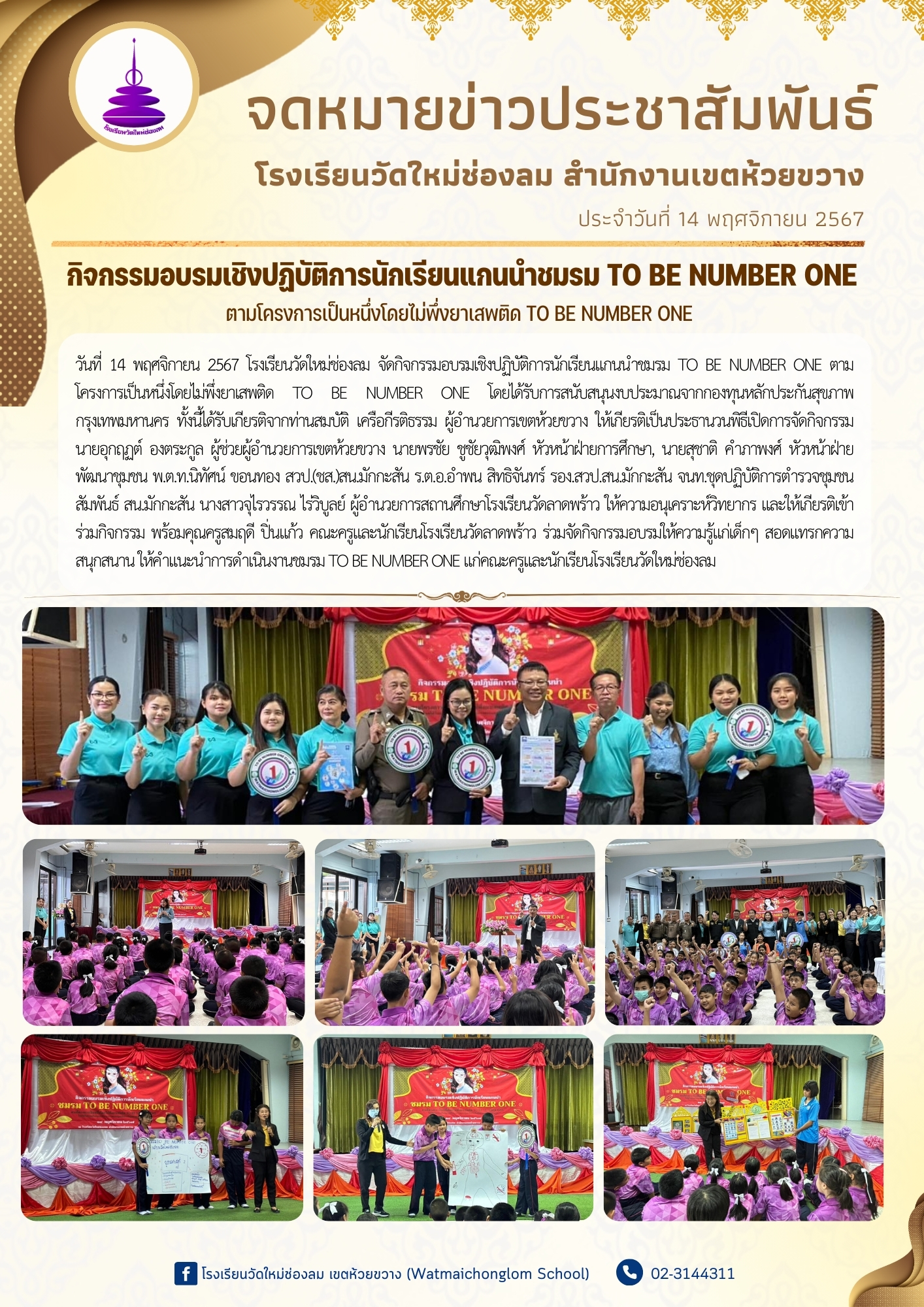 วันที่ 14 พฤศจิกายน 2567 โรงเรียนวัดใหม่ช่องลม จัดกิจกรรมอบรมเชิงปฏิบัติการนักเรียนแกนนำชมรม TO BE NUMBER ONE ตามโครงการเป็นหนึ่งโดยไม่พึ่งยาเสพติด TO BE NUMBER ONE โดยได้รับการสนับสนุนงบประมาณจากกองทุนหลักประกันสุขภาพกรุงเทพมหานคร
