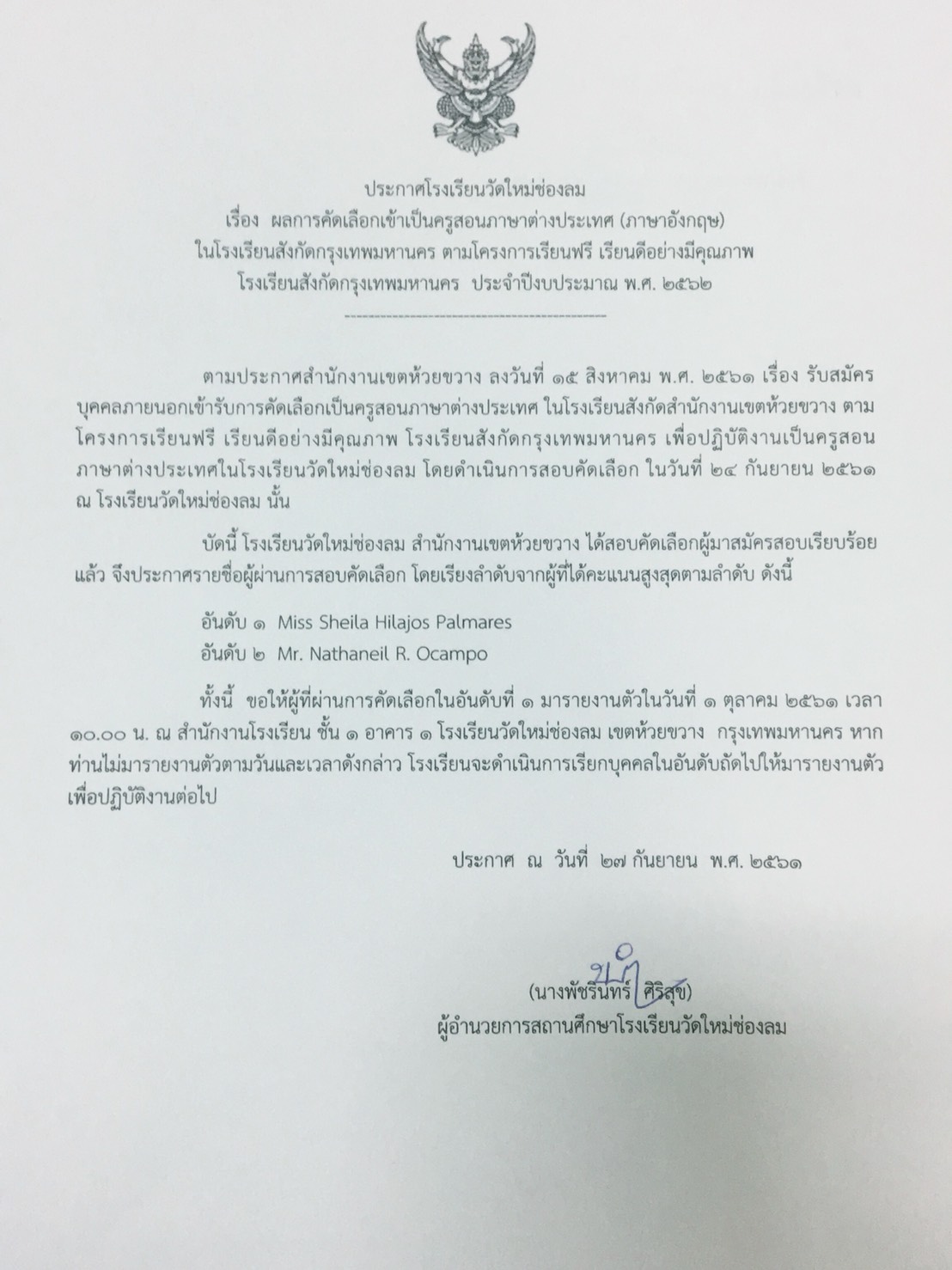 ประกาศผลการคัดเลือกเข้าเป็นครูสอนภาษาต่างประเทศ (ภาษาอังกฤษ)