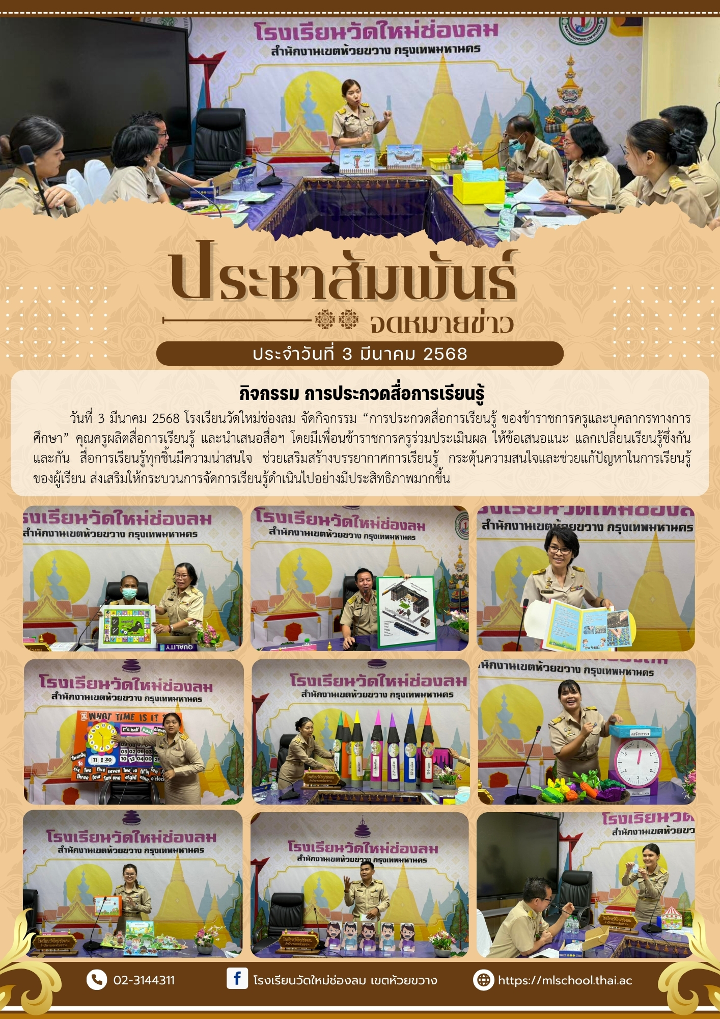 วันที่ 3 มีนาคม 2568 โรงเรียนวัดใหม่ช่องลม จัดกิจกรรม “การประกวดสื่อการเรียนรู้ ของข้าราชการครูและบุคลากรทางการศึกษา” คุณครูผลิตสื่อการเรียนรู้ และนำเสนอสื่อฯ โดยมีเพื่อนข้าราชการครูร่วมประเมินผล ให้ข้อเสนอแนะ แลกเปลี่ยนเรียนรู้ซึ่งกันและกัน สื่อการเรียนรู้ทุกชิ้นมีความน่าสนใจ ช่วยเสริมสร้างบรรยากาศการเรียนรู้ กระตุ้นความสนใจและช่วยแก้ปัญหาในการเรียนรู้ของผู้เรียน ส่งเสริมให้กระบวนการจัดการเรียนรู้ดำเนินไปอย่างมีประสิทธิภาพมากขึ้น