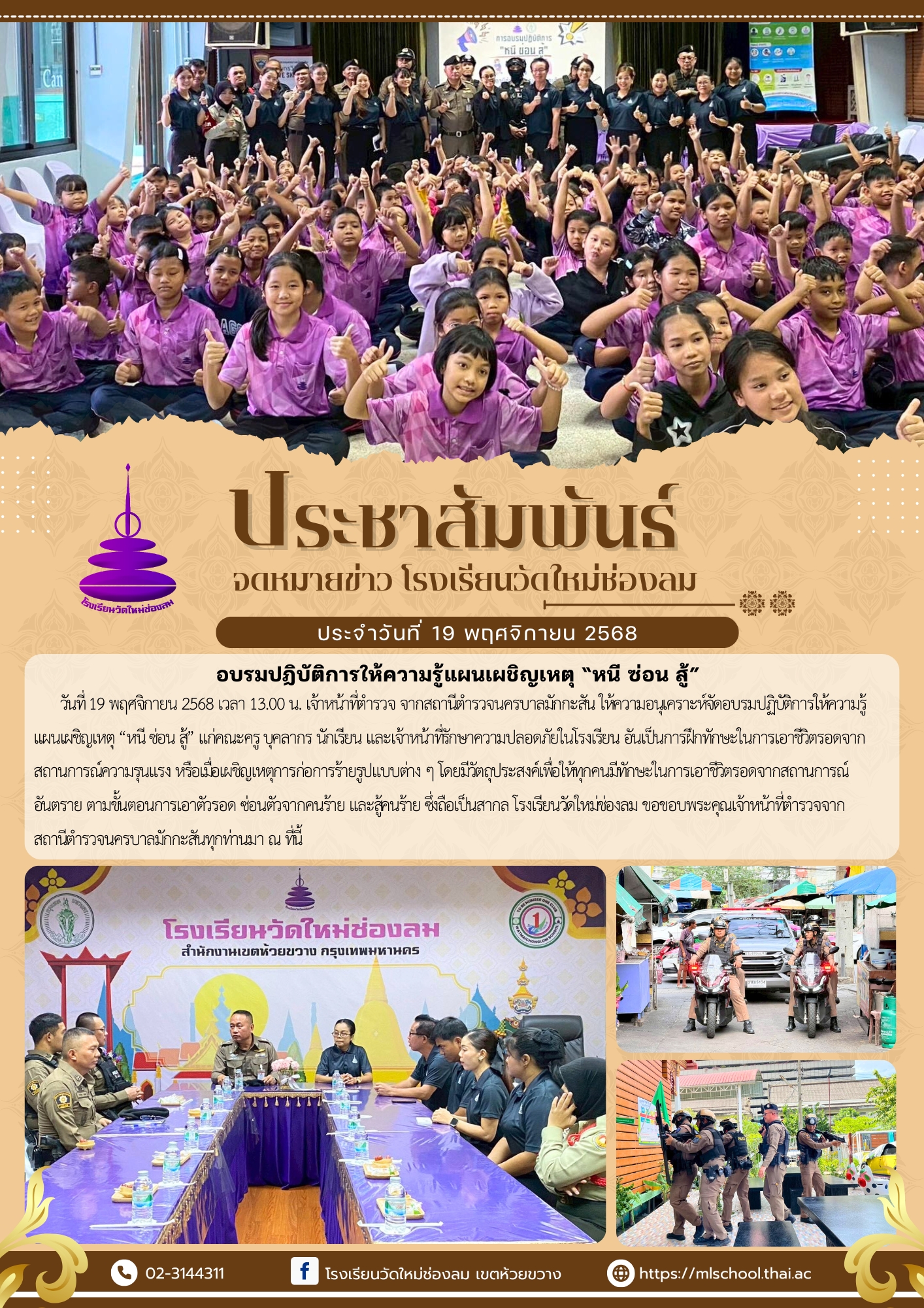 วันที่ 19 พฤศจิกายน 2568 เวลา 13.00 น. เจ้าหน้าที่ตำรวจ จากสถานีตำรวจนครบาลมักกะสัน ให้ความอนุเคราะห์จัดอบรมปฏิบัติการให้ความรู้แผนเผชิญเหตุ “หนี ซ่อน สู้” แก่คณะครู บุคลากร นักเรียน และเจ้าหน้าที่รักษาความปลอดภัยในโรงเรียน อันเป็นการฝึกทักษะในการเอาชีวิตรอดจากสถานการณ์ความรุนแรง หรือเมื่อเผชิญเหตุการก่อการร้ายรูปแบบต่าง ๆ โดยมีวัตถุประสงค์เพื่อให้ทุกคนมีทักษะในการเอาชีวิตรอดจากสถานการณ์อันตราย ตามขั้นตอนการเอาตัวรอด ซ่อนตัวจากคนร้าย และสู้คนร้าย ซึ่งถือเป็นสากล