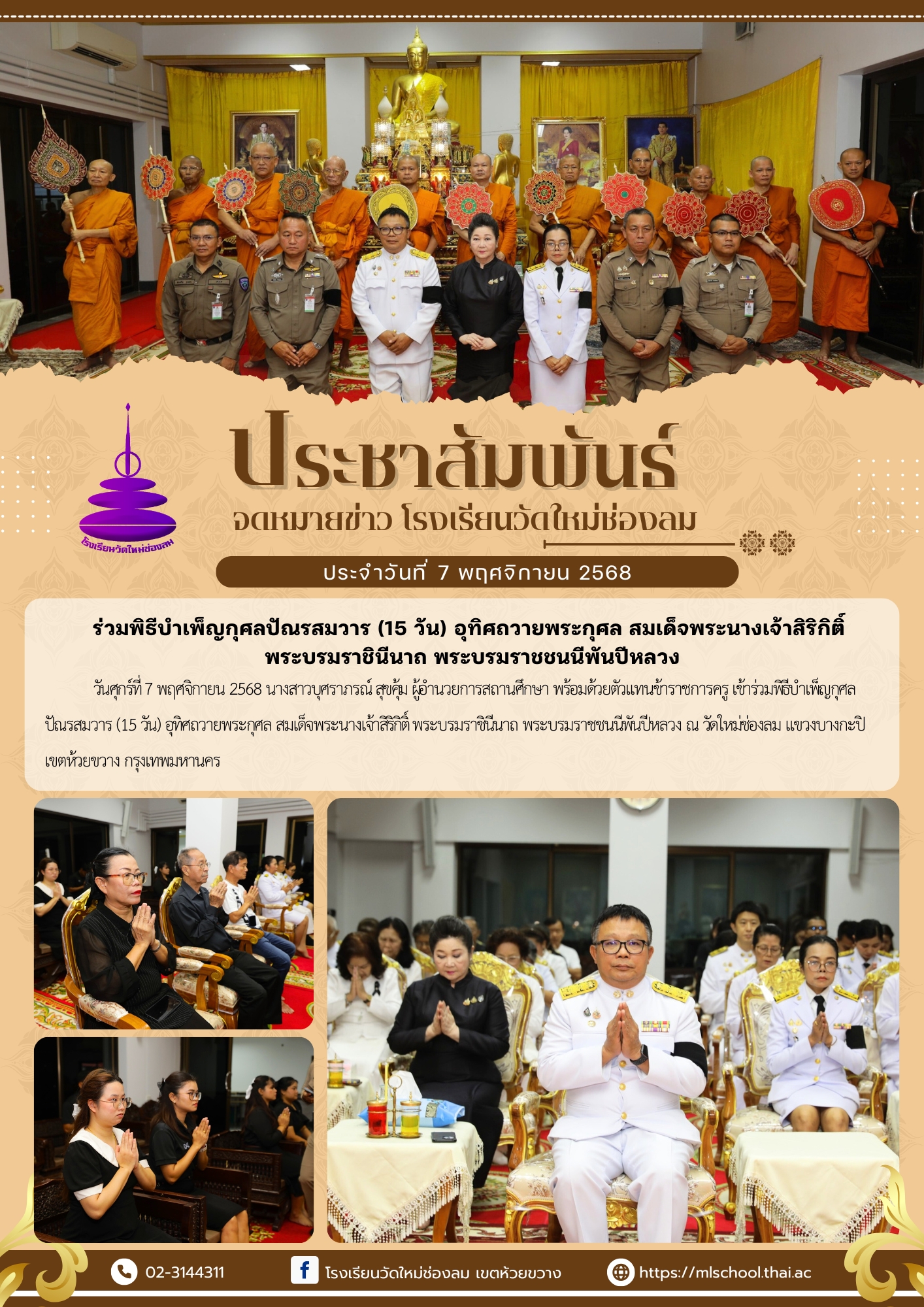 วันศุกร์ที่ 7 พฤศจิกายน 2568 นางสาวบุศราภรณ์ สุขคุ้ม ผู้อำนวยการสถานศึกษา พร้อมด้วยตัวแทนข้าราชการครู เข้าร่วมพิธีบำเพ็ญกุศลปัณรสมวาร (15 วัน) อุทิศถวายพระกุศล สมเด็จพระนางเจ้าสิริกิติ์ พระบรมราชินีนาถ พระบรมราชชนนีพันปีหลวง ณ วัดใหม่ช่องลม แขวงบางกะปิ เขตห้วยขวาง กรุงเทพมหานคร