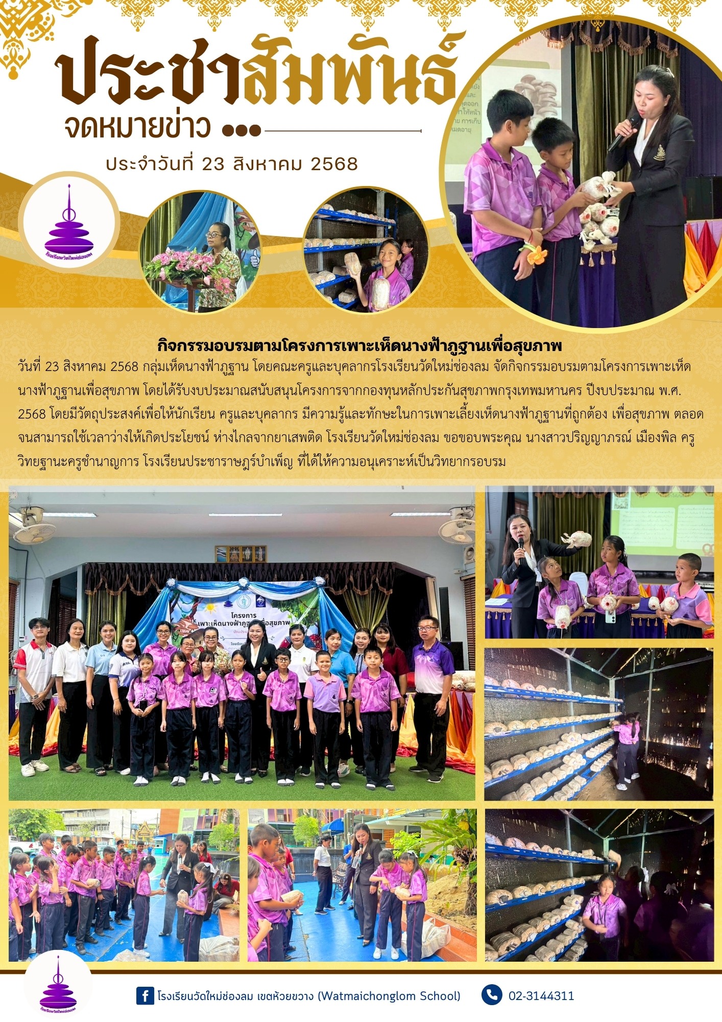 วันที่ 23 สิงหาคม 2568 กลุ่มเห็ดนางฟ้าภูฐาน โดยคณะครูและบุคลากรโรงเรียนวัดใหม่ช่องลม จัดกิจกรรมอบรมตามโครงการเพาะเห็ดนางฟ้าภูฐานเพื่อสุขภาพ โดยได้รับงบประมาณสนับสนุนโครงการจากกองทุนหลักประกันสุขภาพกรุงเทพมหานคร ปีงบประมาณ พ.ศ. 2568 โดยมีวัตถุประสงค์เพื่อให้นักเรียน ครูและบุคลากร มีความรู้และทักษะในการเพาะเลี้ยงเห็ดนางฟ้าภูฐานที่ถูกต้อง เพื่อสุขภาพ ตลอดจนสามารถใช้เวลาว่างให้เกิดประโยชน์ ห่างไกลจากยาเสพติด