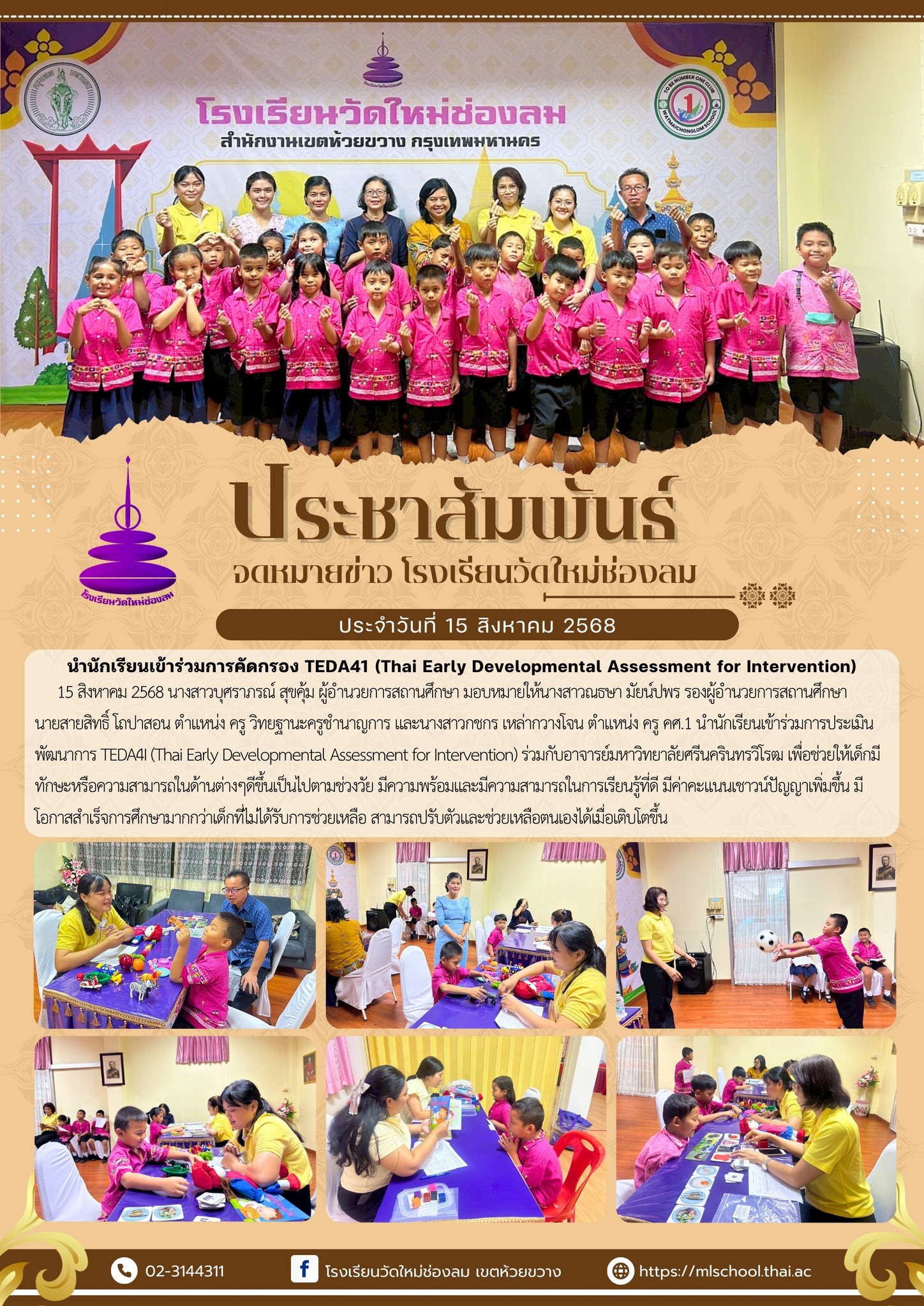 15 สิงหาคม 2568 นางสาวบุศราภรณ์ สุขคุ้ม ผู้อำนวยการสถานศึกษา มอบหมายให้นางสาวณธษา มัยน์ปพร รองผู้อำนวยการสถานศึกษา นายสายสิทธิ์ โถปาสอน ตำแหน่ง ครู วิทยฐานะครูชำนาญการ และนางสาวกชกร เหล่ากวางโจน ตำแหน่ง ครู คศ.1 นำนักเรียนเข้าร่วมการประเมินพัฒนาการ TEDA4I (Thai Early Developmental Assessment for Intervention) ร่วมกับอาจารย์มหาวิทยาลัยศรีนครินทรวิโรฒ เพื่อช่วยให้เด็กมีทักษะหรือความสามารถในด้านต่างๆดีขึ้นเป็นไปตามช่วงวัย มีความพร้อมและมีความสามารถในการเรียนรู้ที่ดี มีค่าคะแนนเชาวน์ปัญญาเพิ่มขึ้น มีโอกาสสำเร็จการศึกษามากกว่าเด็กที่ไม่ได้รับการช่วยเหลือ สามารถปรับตัวและช่วยเหลือตนเองได้เมื่อเติบโตขึ้น