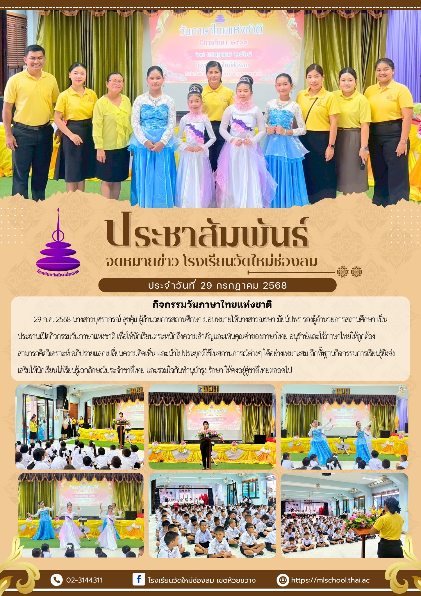 29 ก.ค. 2568 ที่ผ่านมา นางสาวบุศราภรณ์ สุขคุ้ม ผู้อำนวยการสถานศึกษา มอบหมายให้นางสาวณธษา มัยน์ปพร รองผู้อำนวยการสถานศึกษา เป็นประธานเปิดกิจกรรมวันภาษาแห่งชาติ เพื่อให้นักเรียนตระหนักถึงความสำคัญและเห็นคุณค่าของภาษาไทย อนุรักษ์และใช้ภาษาไทยให้ถูกต้อง สามารถคิดวิเคราะห์ อภิปรายแลกเปลี่ยนความคิดเห็น และนำไปประยุกต์ใช้ในสถานการณ์ต่างๆ ได้อย่างเหมาะสม อีกทั้งฐานกิจกรรมการเรียนรู้ยังส่งเสริมให้นักเรียนได้เรียนรู้เอกลักษณ์ประจำชาติไทย และร่วมใจกันทำนุบำรุง รักษา ให้คงอยู่คู่ชาติไทยตลอดไป