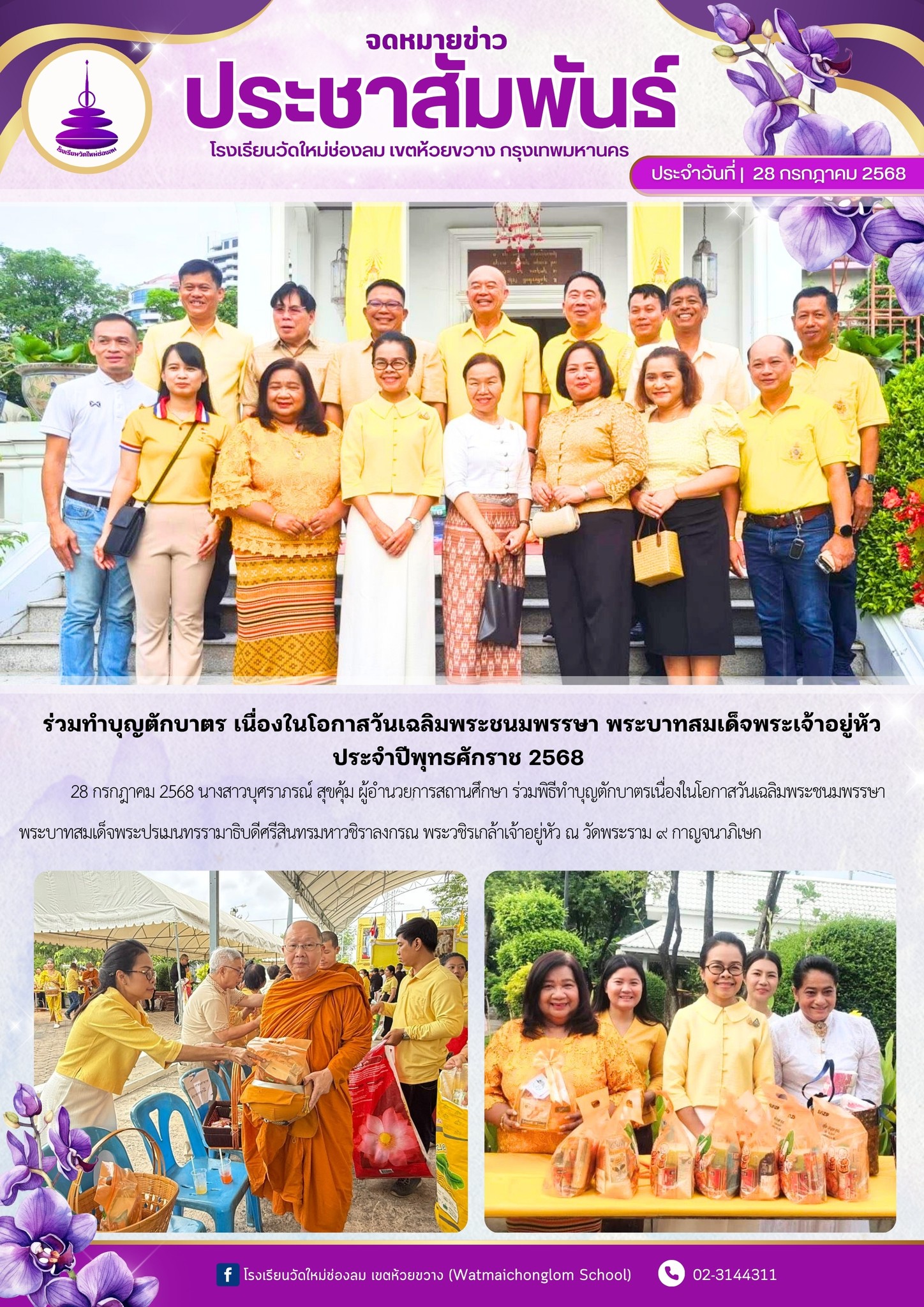 28 กรกฎาคม 2568 นางสาวบุศราภรณ์ สุขคุ้ม ผู้อำนวยการสถานศึกษา ร่วมพิธีทำบุญตักบาตรเนื่องในโอกาสวันเฉลิมพระชนมพรรษา พระบาทสมเด็จพระปรเมนทรรามาธิบดีศรีสินทรมหาวชิราลงกรณ พระวชิรเกล้าเจ้าอยู่หัว ณ วัดพระราม ๙ กาญจนาภิเษก