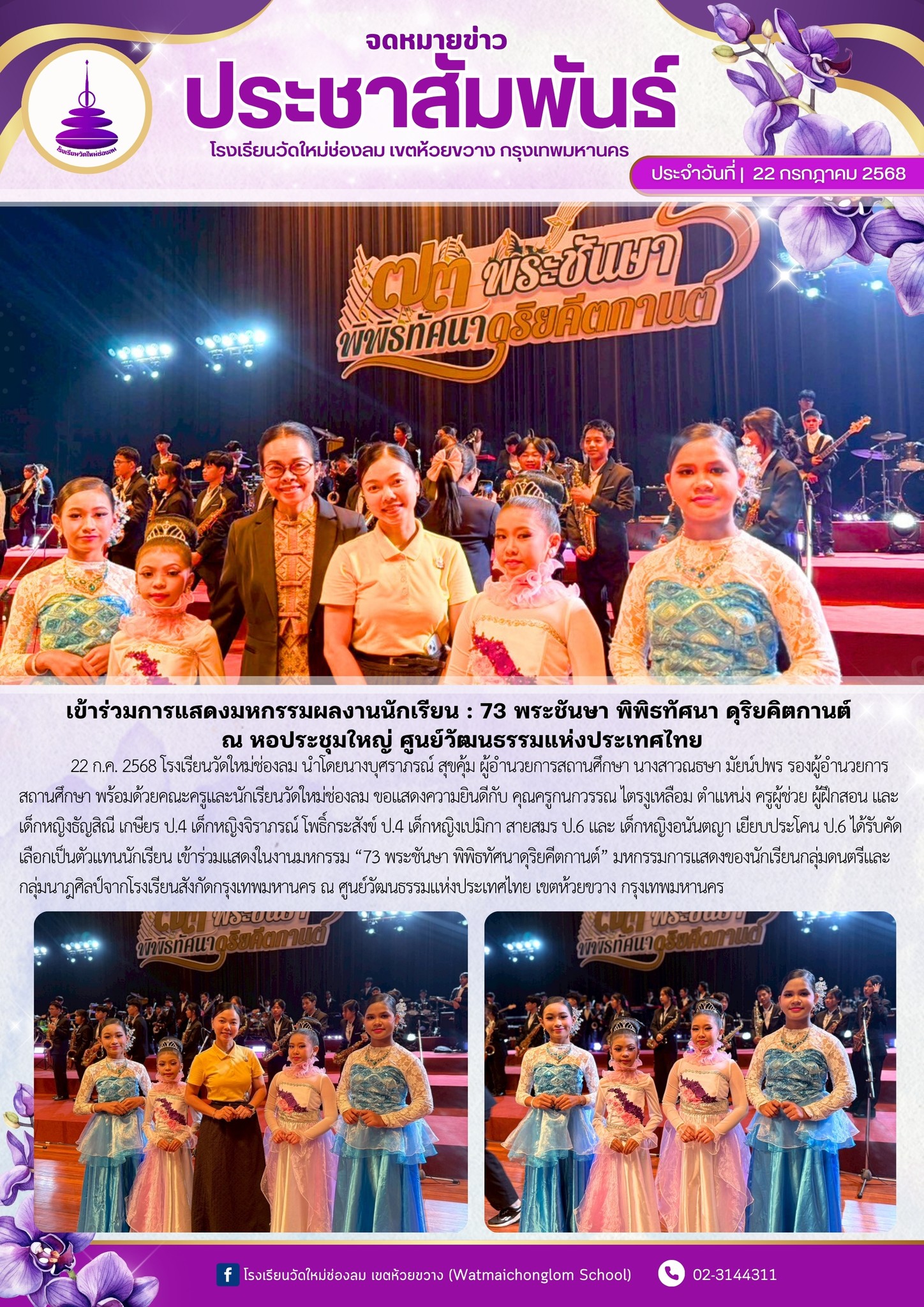 ได้รับคัดเลือกเป็นตัวแทนนักเรียน เข้าร่วมแสดงในงานมหกรรม “73 พระชันษา พิพิธทัศนาดุริยคีตกานต์” มหกรรมการแสดงของนักเรียนกลุ่มดนตรีและกลุ่มนาฎศิลป์จากโรงเรียนสังกัดกรุงเทพมหานคร ณ ศูนย์วัฒนธรรมแห่งประเทศไทย เขตห้วยขวาง กรุงเทพมหานคร เมื่อวันที่ 22 กรกฎาคม 2568 ถือเป็นความภาคภูมิใจอย่างยิ่งของทางโรงเรียน ผู้ปกครอง และเป็นแบบอย่างที่ดีให้กับนักเรียนคนอื่นๆ ในด้านความสามารถด้านนาฏศิลป์ ความตั้งใจ ความเพียรพยายามและความวิริยะอุตสาหะ