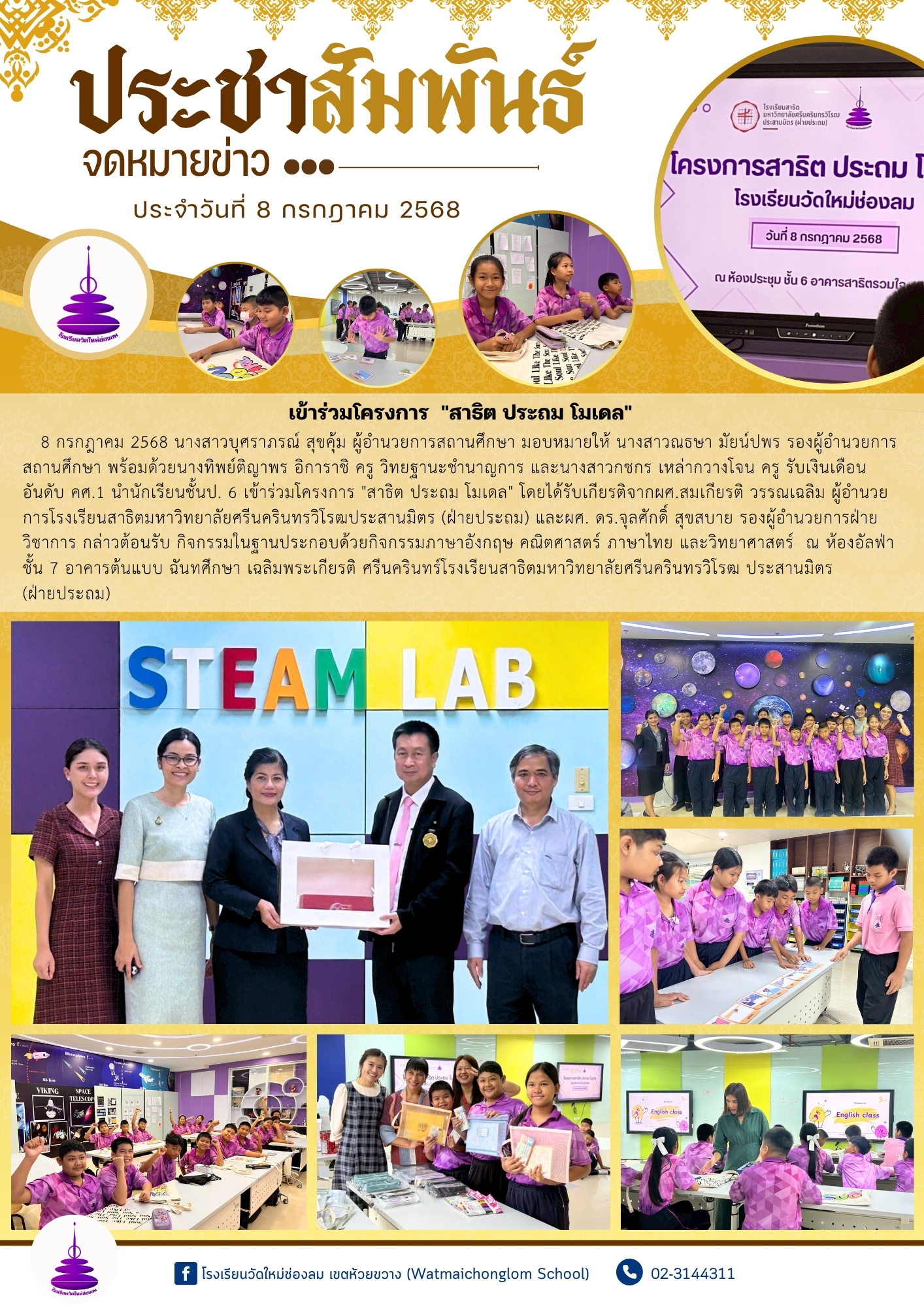 วันที่ 8 กรกฎาคม 2568 นางสาวบุศราภรณ์ สุขคุ้ม ผู้อำนวยการสถานศึกษา มอบหมายให้ นางสาวณธษา มัยน์ปพร รองผู้อำนวยการสถานศึกษา พร้อมด้วยนางทิพย์ติญาพร อิการาชิ ครู วิทยฐานะชำนาญการ และนางสาวกชกร เหล่ากวางโจน ครู รับเงินเดือนอันดับ คศ.1 นำนักเรียนชั้นป. 6 เข้าร่วมโครงการ "สาธิต ประถม โมเดล" โดยได้รับเกียรติจากผศ.สมเกียรติ วรรณเฉลิม ผู้อำนวยการโรงเรียนสาธิตมหาวิทยาลัยศรีนครินทรวิโรฒประสานมิตร (ฝ่ายประถม) และผศ. ดร.จุลศักดิ์ สุขสบาย รองผู้อำนวยการฝ่ายวิชาการ กล่าวต้อนรับ กิจกรรมในฐานประกอบด้วยกิจกรรมภาษาอังกฤษ คณิตศาสตร์ ภาษาไทย และวิทยาศาสตร์ ณ ห้องอัลฟ่า ชั้น 7 อาคารต้นแบบ ฉันทศึกษา เฉลิมพระเกียรติ ศรีนครินทร์โรงเรียนสาธิตมหาวิทยาลัยศรีนครินทรวิโรฒ ประสานมิตร