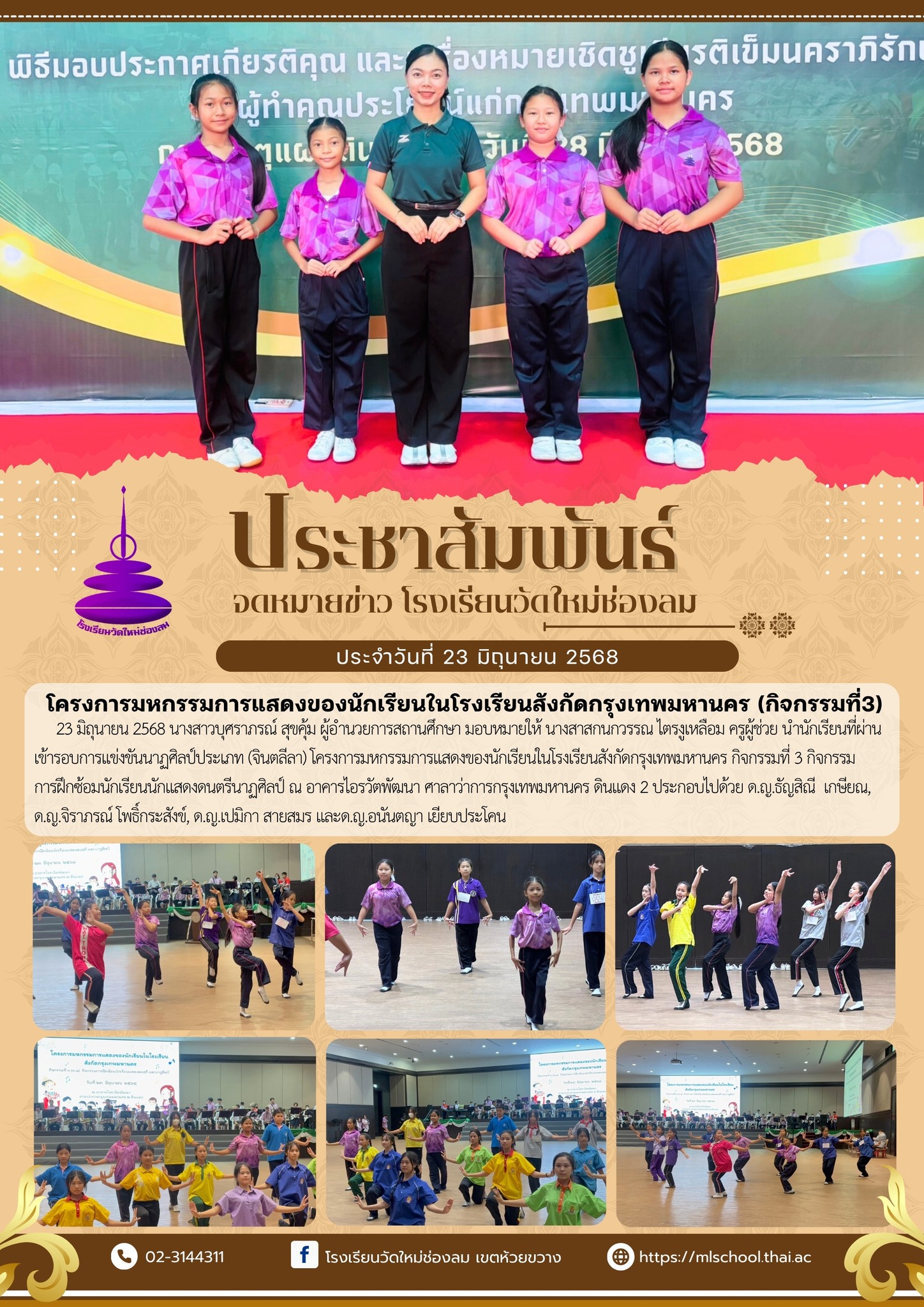 23 มิถุนายน 2568 นางสาวบุศราภรณ์ สุขคุ้ม ผู้อำนวยการสถานศึกษา มอบหมายให้ นางสาสกนกวรรณ ไตรงูเหลือม ครูผู้ช่วย นำนักเรียนที่ผ่านเข้ารอบการแข่งขันนาฏศิลป์ประเภท (จินตลีลา) โครงการมหกรรมการแสดงของนักเรียนในโรงเรียนสังกัดกรุงเทพมหานคร กิจกรรมที่ 3 กิจกรรมการฝึกซ้อมนักเรียนนักแสดงดนตรีนาฏศิลป์ ณ อาคารไอรวัตพัฒนา ศาลาว่าการกรุงเทพมหานคร ดินแดง 2 ประกอบไปด้วย