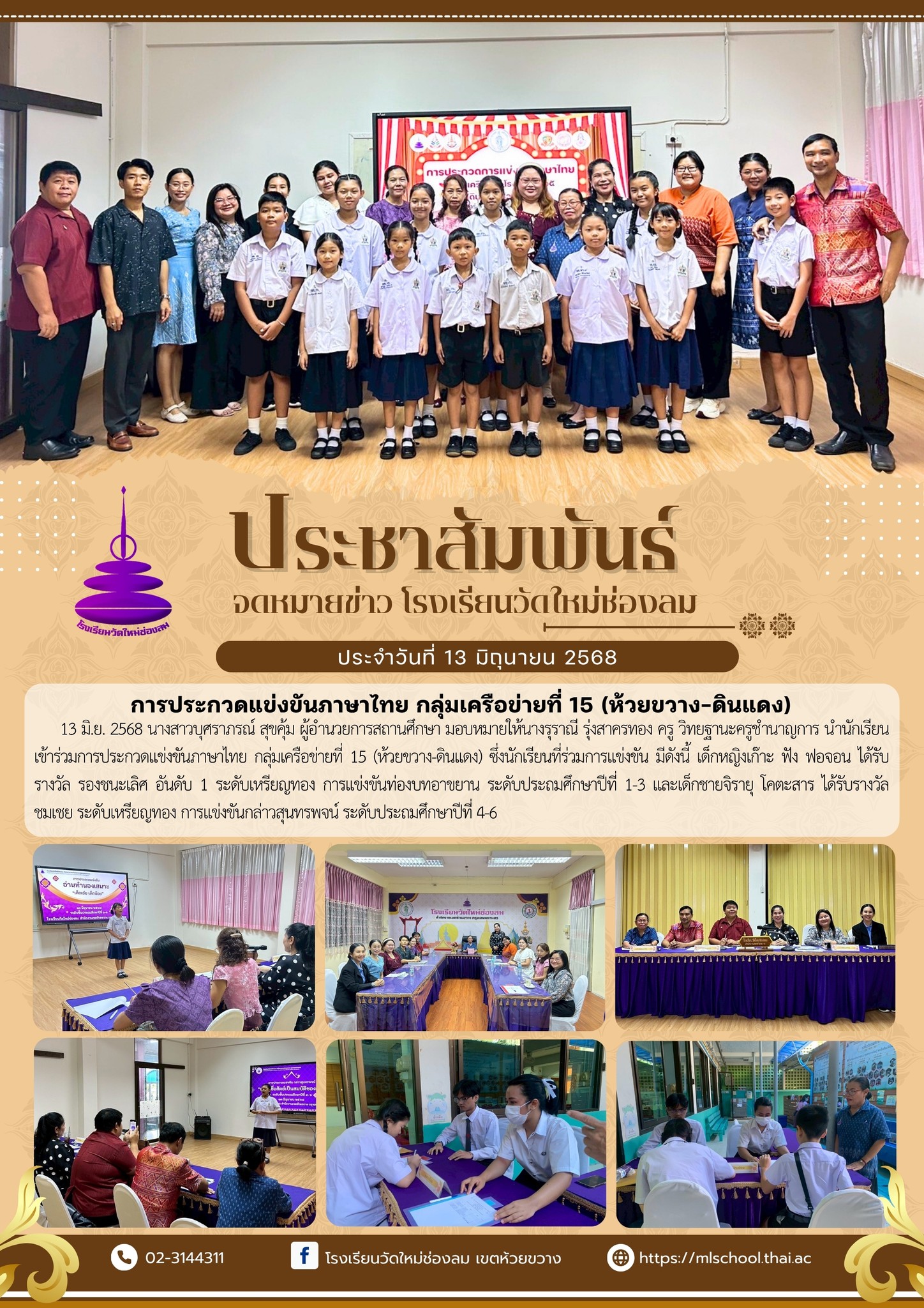 13 มิ.ย. 2568 ที่ผ่านมานางสาวบุศราภรณ์ สุขคุ้ม ผู้อำนวยการสถานศึกษา มอบหมายให้นางรุราณี รุ่งสาครทอง ครู วิทยฐานะครูชำนาญการ นำนักเรียนเข้าร่วมการประกวดแข่งขันภาษาไทย กลุ่มเครือข่ายที่ 15 (ห้วยขวาง-ดินแดง) ซึ่งนักเรียนที่ร่วมการแข่งขัน มีดังนี้
