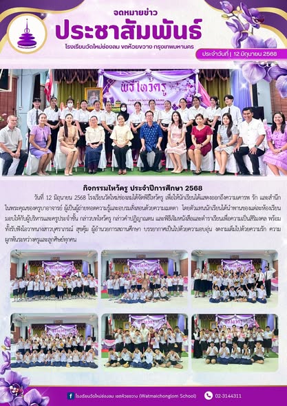 วันที่ 12 มิถุนายน 2568 โรงเรียนวัดใหม่ช่องลมได้จัดพิธีไหว้ครู เพื่อให้นักเรียนได้แสดงออกถึงความเคารพ รัก และสำนึกในพระคุณของครูบาอาจารย์ ผู้ถ่ายทอดความรู้และอบรมสั่งสอนด้วยความเมตตา โดยตัวแทนนักเรียนได้นำพานของแต่ละห้องเรียนมอบให้กับผู้บริหารและครูประจำชั้น กล่าวบทไหว้ครู กล่าวคำปฏิญาณตน และพิธีเจิมหนังสือและตำราเรียนเพื่อความเป็นสิริมงคล พร้อมทั้งรับฟังโอวาทนางสาวบุศราภรณ์ สุขคุ้ม ผู้อำนวยการสถานศึกษา บรรยากาศเป็นไปด้วยความอบอุ่น งดงามเต็มไปด้วยความรัก ความผูกพันระหว่างครูและลูกศิษย์ทุกคน