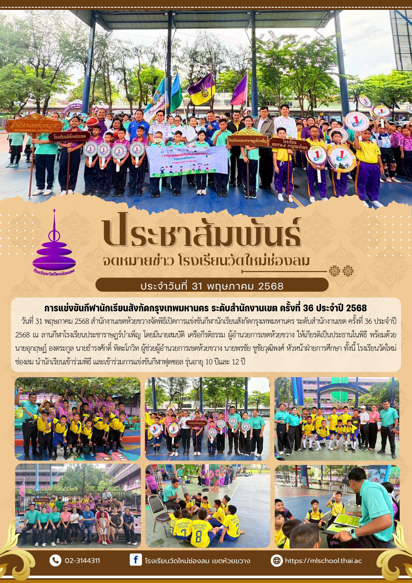 วันที่ 31 พฤษภาคม 2568 สำนักงานเขตห้วยขวางจัดพิธีเปิดการแข่งขันกีฬานักเรียนสังกัดกรุงเทพมหานคร ระดับสำนักงานเขต ครั้งที่ 36 ประจำปี 2568 ณ ลานกีฬาโรงเรียนประชาราษฎร์บำเพ็ญ โดยมีนายสมบัติ เครือกีรติธรรม ผู้อำนวยการเขตห้วยขวาง ให้เกียรติเป็นประธานในพิธี พร้อมด้วย นายอุกฤษฏ์ องตระกูล นายธำรงศักดิ์ หิตะโกวิท ผู้ช่วยผู้อำนวยการเขตห้วยขวาง นายพรชัย ชูชัยวุฒิพงศ์ หัวหน้าฝ่ายการศึกษา ทั้งนี้ โรงเรียนวัดใหม่ช่องลม นำนักเรียนเข้าร่วมพิธี และเข้าร่วมการแข่งขันกีฬาฟุตซอล รุ่นอายุ 10 ปีและ 12 ปี