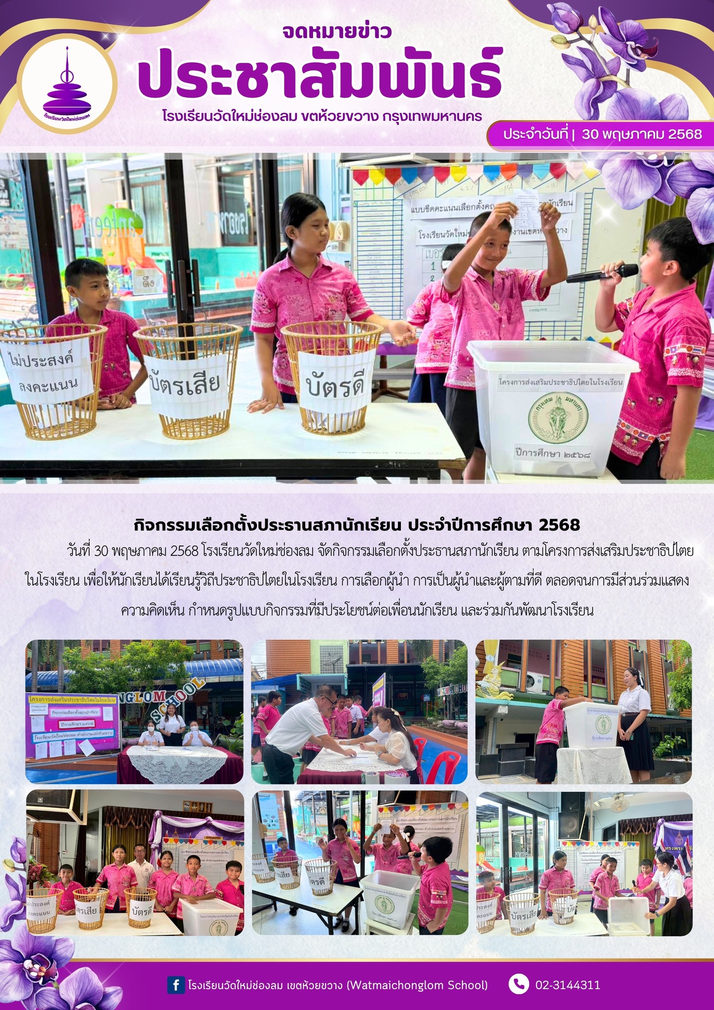 วันที่ 30 พฤษภาคม 2568 โรงเรียนวัดใหม่ช่องลม จัดกิจกรรมเลือกตั้งประธานสภานักเรียน ตามโครงการส่งเสริมประชาธิปไตยในโรงเรียน เพื่อให้นักเรียนได้เรียนรู้วิถีประชาธิปไตยในโรงเรียน การเลือกผู้นำ การเป็นผู้นำและผู้ตามที่ดี ตลอดจนการมีส่วนร่วมแสดงความคิดเห็น กำหนดรูปแบบกิจกรรมที่มีประโยชน์ต่อเพื่อนนักเรียน และร่วมกันพัฒนาโรงเรียน
