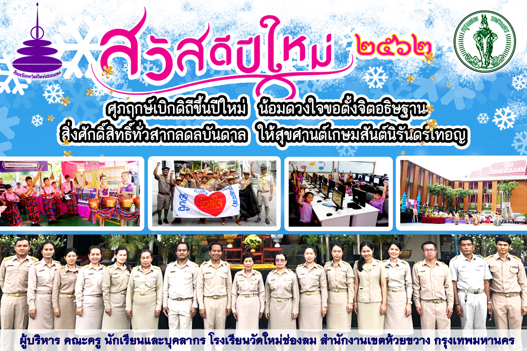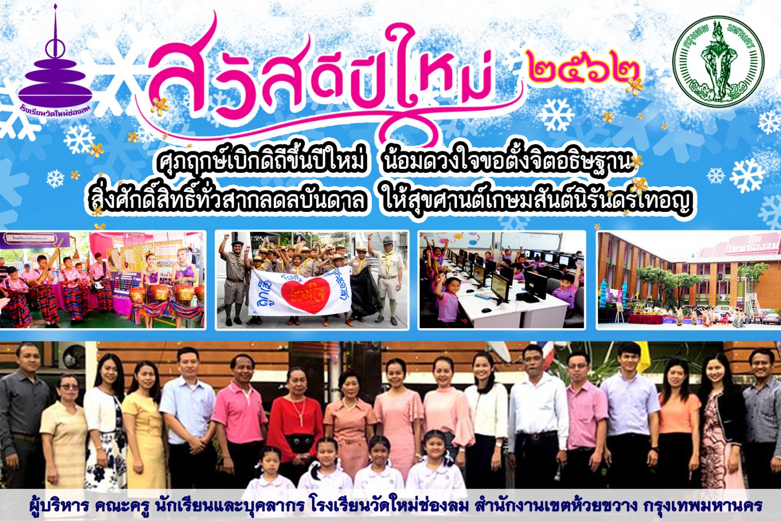 ส.ค.ส. ส่งความสุขปีใหม่ โรงเรียนวัดใหม่ช่องลม สำนักงานเขตห้วยขวาง ขออาราธนาคุณพระศรีรัตนตรัย สิ่งศักดิ์สิทธิ์ที่เคารพนับถือ ดลบันดาลให้ทุกท่านประสบแต่ความสุข ความเจริญ สุขภาพแข็ง ตลอดปีพุทธศักราช 2562