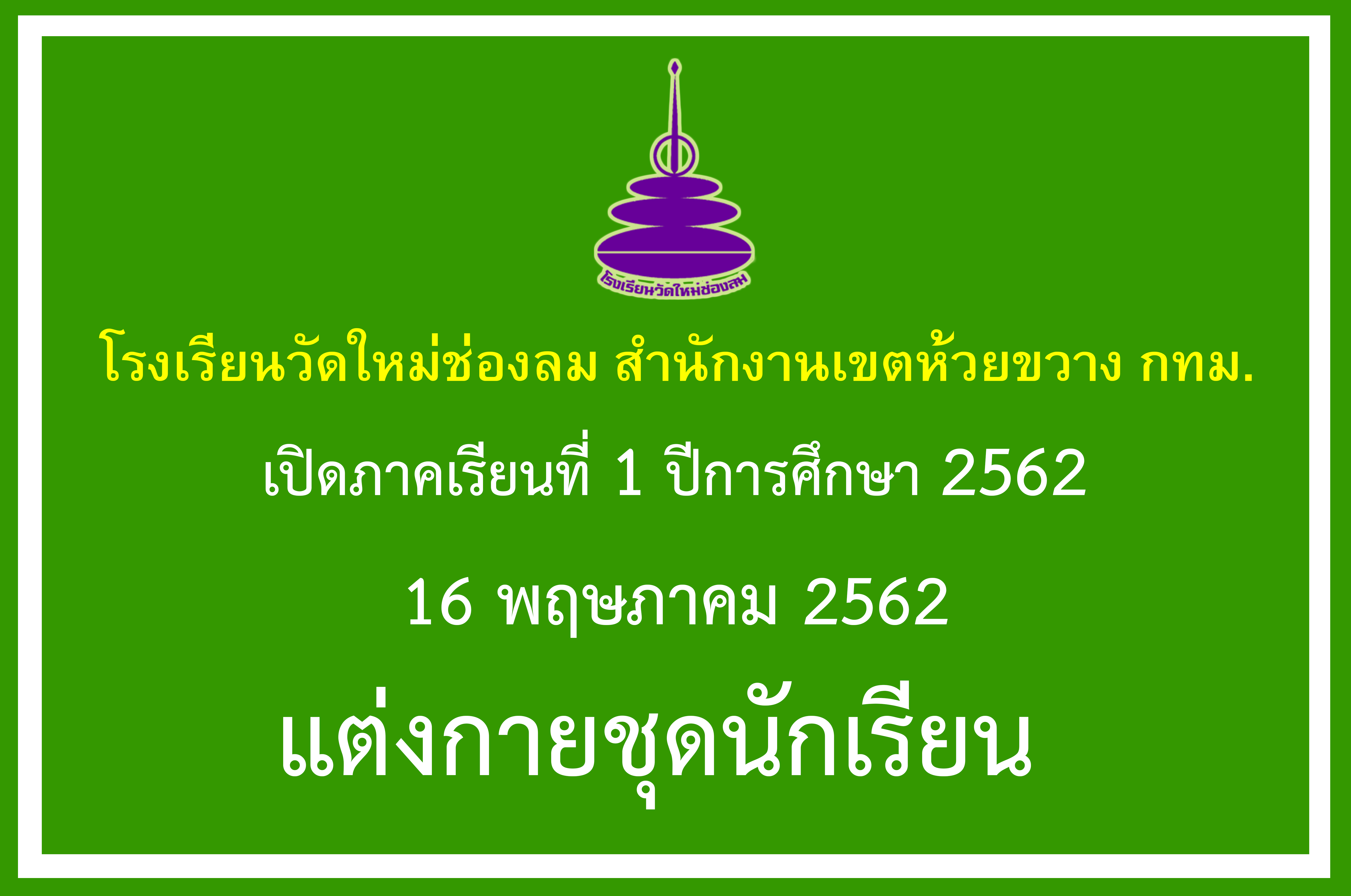 เปิดภาคเรียนที่ 1 ปีการศึกษา 2562 ในวันที่ 16 พฤษภาคม 2562 ให้นักเรียนทุกคนแต่งกายชุดนักเรียน ถูกต้องตามระเบียบของโรงเรียน