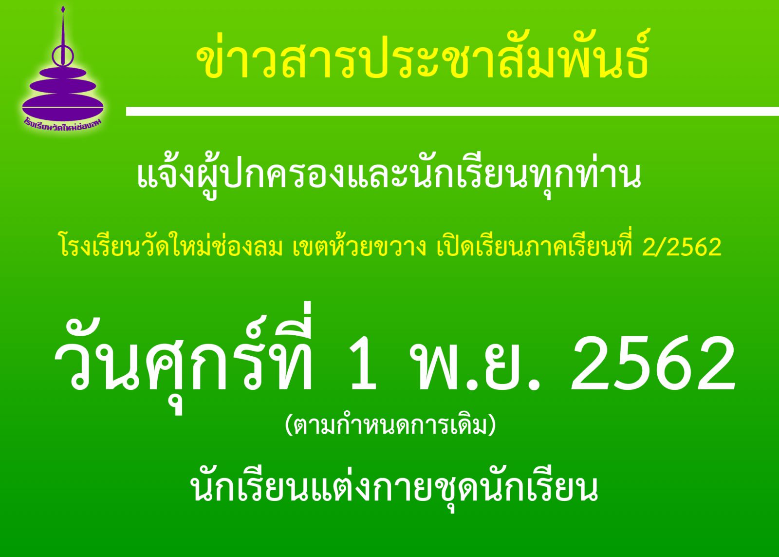 แจ้งข่าวสาร การเปิดภาคเรียนที่2/2562