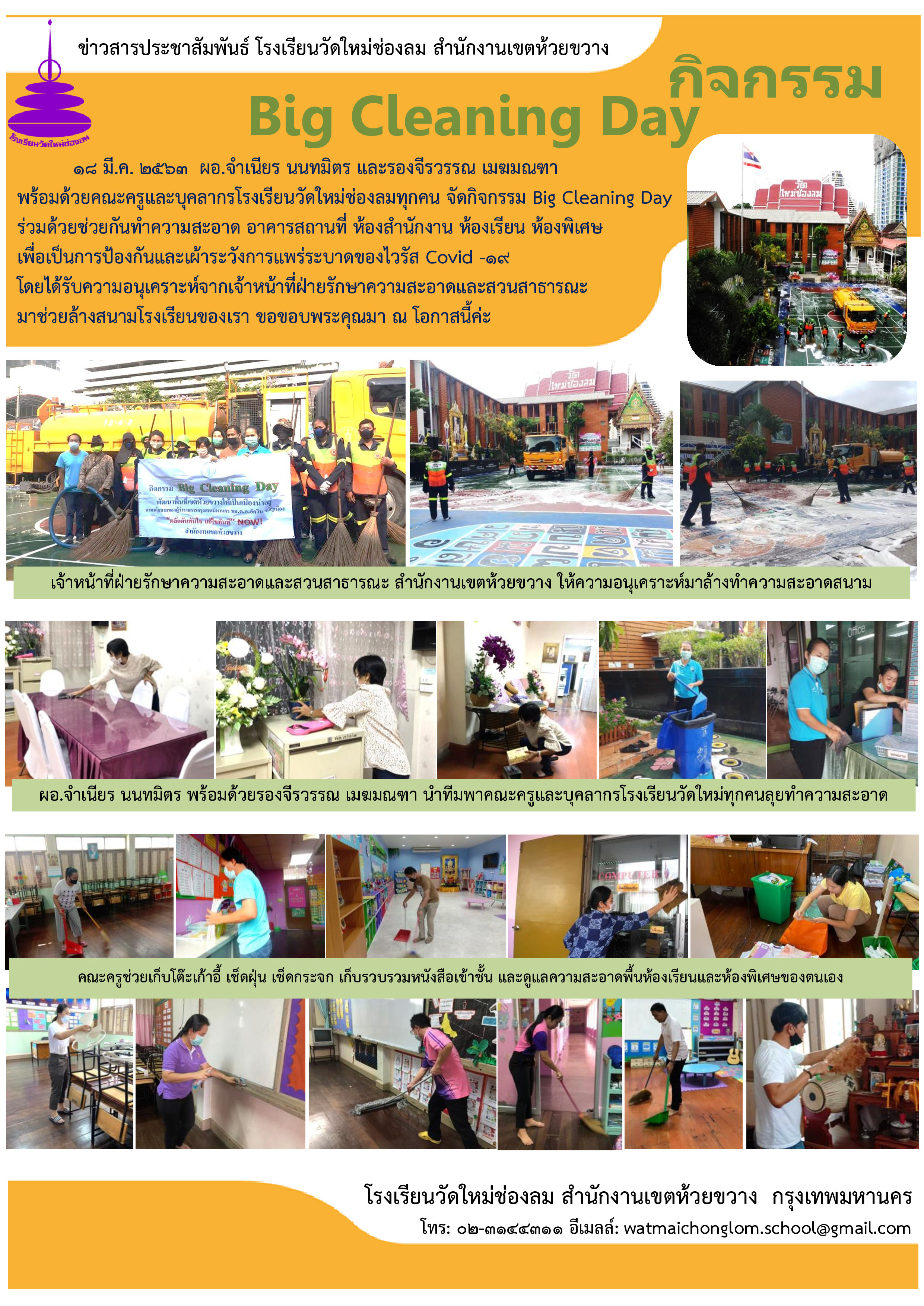 เมื่อเช้าวันที่ ๑๘ มีนาคม ๒๕๖๓ ผู้บริหาร คณะครูและบุคลากรโรงเรียนวัดใหม่ช่องลม ทำกิจกรรม Big Cleaning Day ห้องสำนักงาน ห้องเรียน ห้องปฏิบัติการ และห้องพิเศษ เพื่อเตรียมความพร้อมและเฝ้าระวังป้องกันไวรัส Covid-19