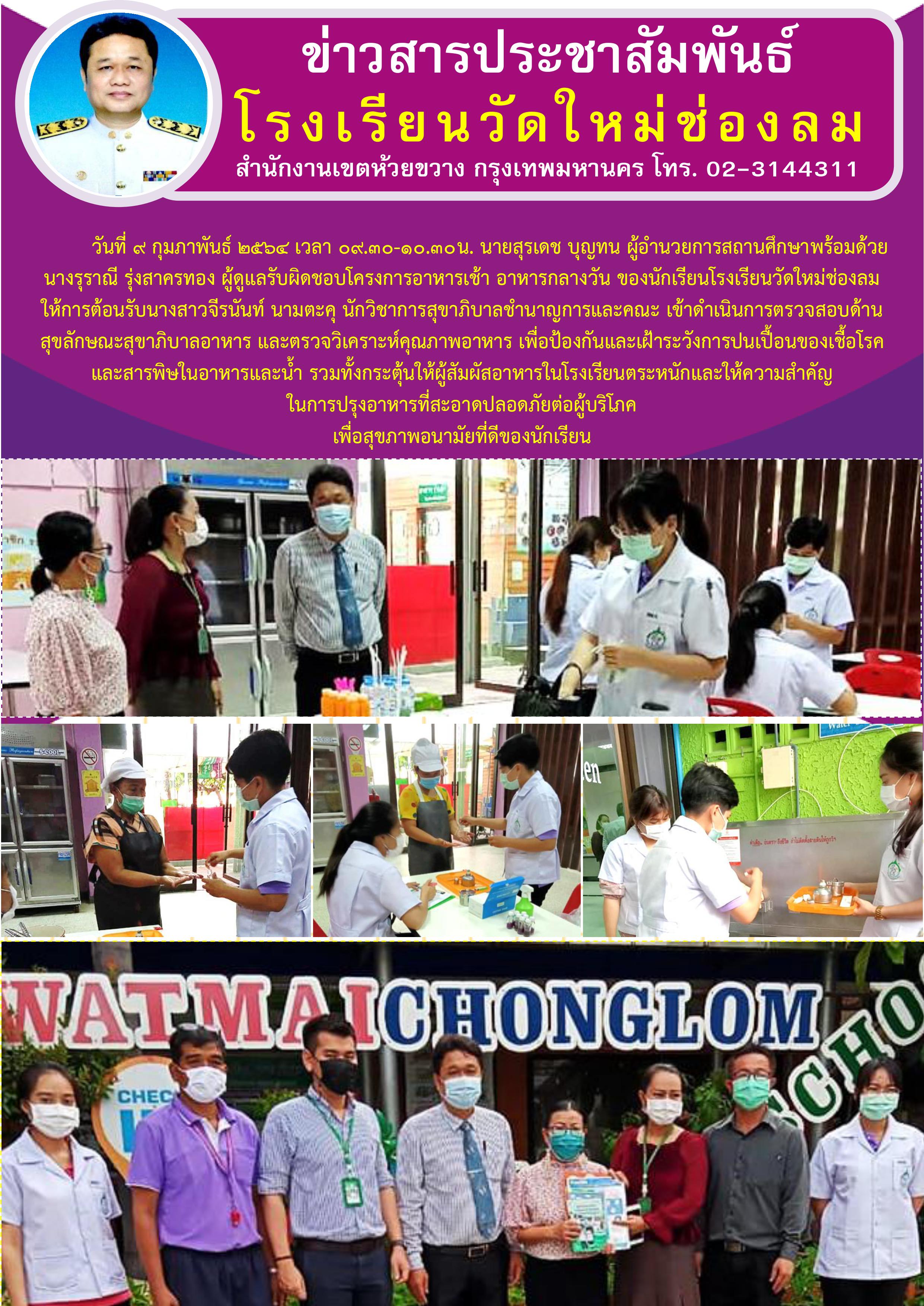 นายสุรเดช บุญทน ผู้อำนวยการสถานศึกษา พร้อมด้วยนางรุราณี รุ่งสาครทอง ผู้ดูแลรับผิดชอบโครงการอาหารเช้า อาหารกลางวัน ของนักเรียนโรงเรียนวัดใหม่ช่องลมให้การต้อนรับนางสาวจีรนันท์ นามตะคุ นักวิชาการสุขาภิบาลชำนาญการและคณะ เข้าดำเนินการตรวจสอบด้านสุขลักษณะสุขาภิบาลอาหาร และตรวจวิเคราะห์คุณภาพอาหาร