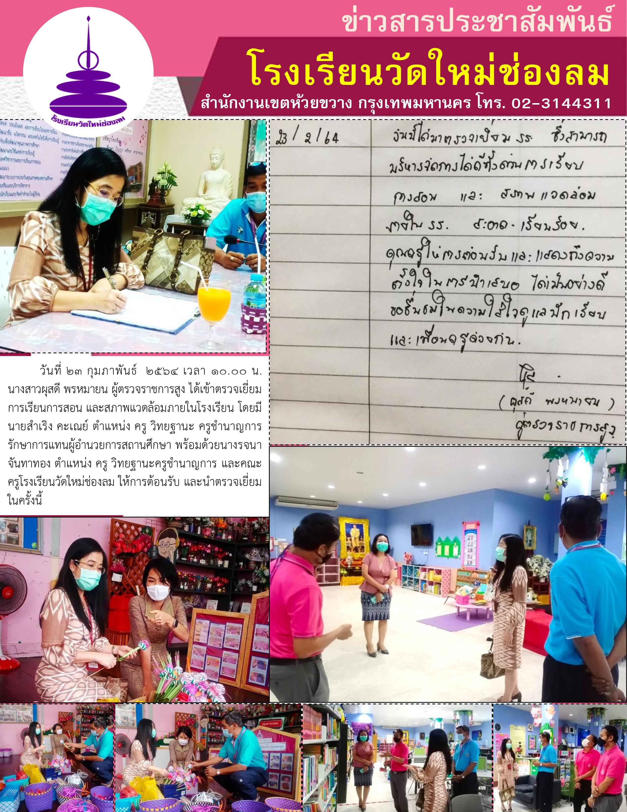 วันที่ 23 กุมภาพันธ์ 2564 เวลา 10.00 น. นางสาวผุสดี พรหมายน ผู้ตรวจราชการสูง ได้เข้าตรวจเยี่ยมการเรียนการสอน และสภาพแวดล้อมภายในโรงเรียน โดยมีนายสำเริง คะเณย์ ตำแหน่ง ครู วิทยฐานะ ครูชำนาญการ รักษาการแทนผู้อำนวยการสถานศึกษา พร้อมด้วยนางรจนา จันทาทอง ตำแหน่ง ครู วิทยฐานะครูชำนาญการ และคณะครูโรงเรียนวัดใหม่ช่องลม ให้การต้อนรับ และนำตรวจเยี่ยมในครั้งนี้